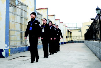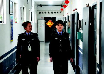 早上8点20分,女子监区门前悬挂着的两个大红灯笼迎着微风轻轻摆动,身着警服的女警们列队而过,巡查监区、谈话教育、组织在押人员吃早饭……紧张而忙碌的一天由此开始。“我们大队有21名女警,最大的47岁、最小的23岁,分三班全天候轮流执勤。”女子执勤大队大队长宋华倩指着监区内长200米的走廊告诉记者,执勤女警白天每隔15分钟、晚上每隔20分钟要巡视一个来回,一天下来至少要走十多里的路。