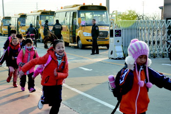 2日,崂山区晓望小学的孩子们走下校车,进入校园,开始了新学期的生活。新学期,交运温馨校车在市区、城阳区、崂山区新增线路56条,为城阳11中、崂山区沙子口中心小学等8所中小学开通校车。据了解,交运温馨校车今年计划新增校车300部,相继在青岛市区、农村地区陆续投放。 本报记者 官文涛 摄影报道