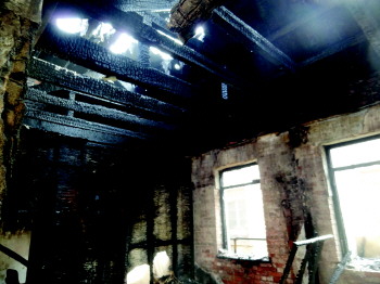由于失火居民楼不临街,记者沿着一条宽约2米的小路一直走进去二三十米远后,才来到火灾第一现场。起火的是一栋两层老旧居民楼的二楼,顺着不足1米宽、甚至部分扶手都不知去向的楼梯,记者小心翼翼地上了二楼。火灾中烧得最严重的是一间面积约三四十平方米的房间,整个楼顶被烧穿。大火还顺着木质的屋顶蔓延,北侧房间的屋顶也被烧穿,几根木头房梁虽然没有坍塌,但也摇摇欲坠。大量被烧焦的杂物堆在屋里,火苗虽然被扑灭,但仍冒着黑烟,并散发着刺鼻的焦糊味。