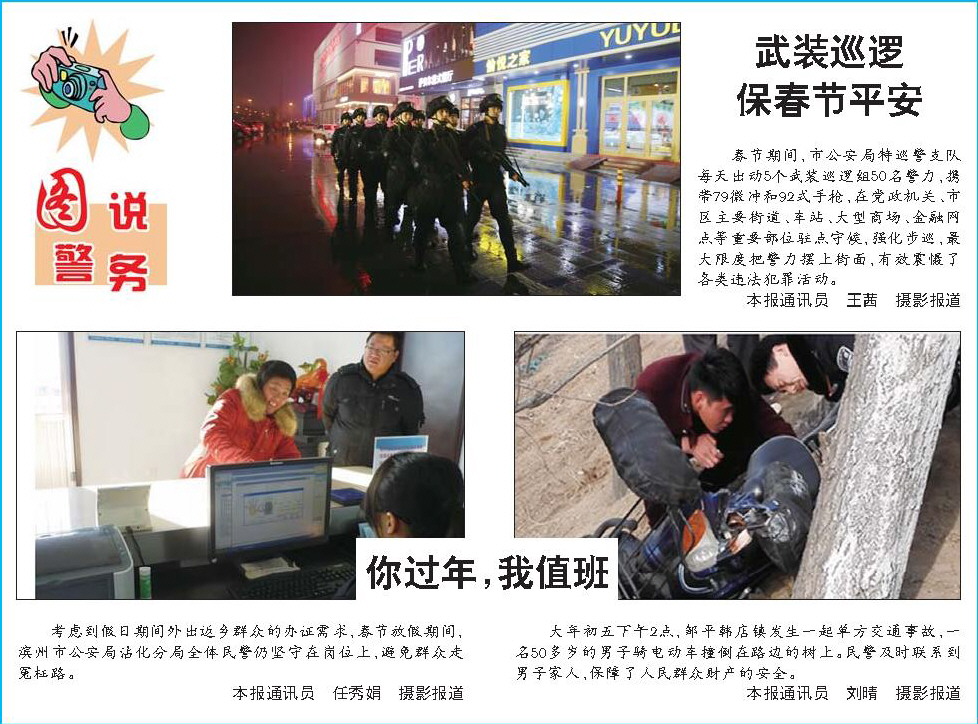 春节期间,市公安局特巡警支队每天出动5个武装巡逻组50名警力,携带79微冲和92式手枪,在党政机关、市区主要街道、车站、大型商场、金融网点等重要部位驻点守候,强化步巡,最大限度把警力摆上街面,有效震慑了各类违法犯罪活动。