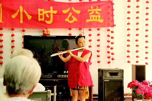 女儿说,姥爷这样做,她也要跟着做。她也跟姥爷去老年公寓慰问老人,还叫上了她的老师同学,为老人表演节目。中秋节给老人分月饼分毛巾。老人们平时很孤独,见了孩子亲得不得了。