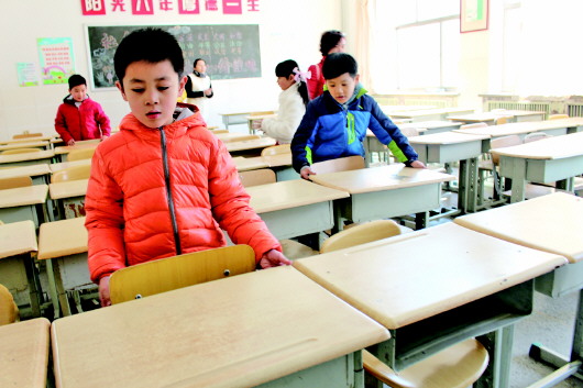 4日,学校还未开学,张家铭就约着几名同学来到教室整理桌椅。 本报记者 李飞 摄