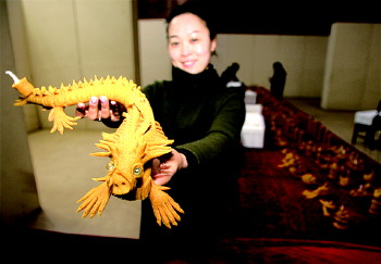 3月4日,在莱阳市图书馆,工作人员正在布置灯碗作品实物展。灯碗是莱阳农民一种特有的信俗活动,起源于康熙年间,2013年,莱阳豆面灯碗被批准为山东省级非物质文化遗产保护项目。灯碗以豆面为主要原料,寓意丰收喜庆。500余件灯碗作品将于正月十六、十七两天在莱阳市图书馆展出。 本报记者 赵金阳 摄影报道