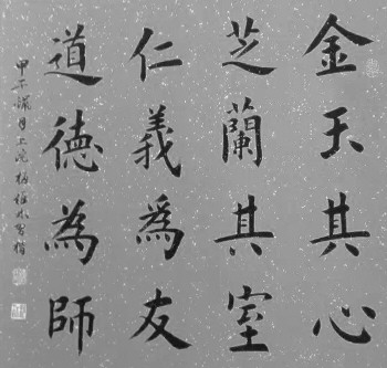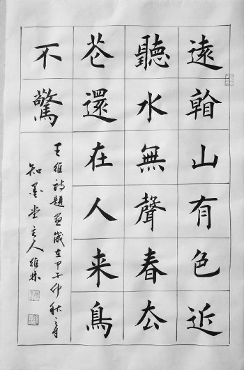 梅维林初习书法是以颜体楷书入门,后又学习欧体楷书,跟随中国欧体楷书大师田英章先生学习。所学楷书法度森严,端庄大气,一丝不苟。