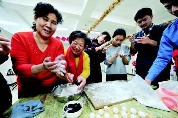 在宽敞整洁的活动室内,大家分成两组,一组调馅儿、和面、包汤圆,另一组则在志愿者的帮助下,认认真真地编起了中国结、糊起了灯笼。居民邹女士是社区的一名志愿者,一大早她就赶到了活动室,与其他志愿者一起忙碌起来,“我们先做好包汤圆的前期工作,等会儿让大家光来包就行了。”邹女士说着就行动起来。