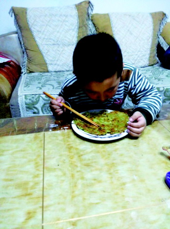 一位苯丙酮尿症患儿正在吃饭,食物是用特制面粉和萝卜丝做成的烙饼。(家长供图)。
