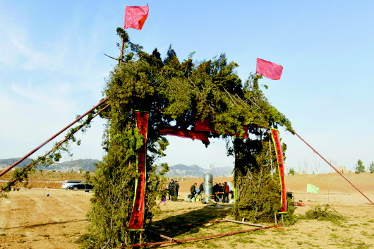 ▲打铁花现场搭起挂满树枝的架子,并喷上水,铁水打在上面就会火星四溅。