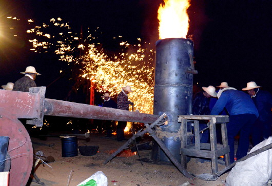 ▲现场的撅嘴炉用来熔炼铁水。