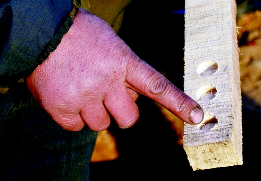 ▲湿柳木棍上打上三个孔,这就是装铁水的容器。