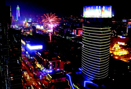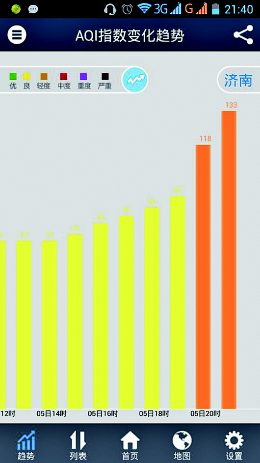 3月5日元宵夜,济南上空烟花此起彼伏(大图),鞭炮声声不断,市区污染程度也随之加大。济南空气质量指数(AQI)18时之前为“良”,到了20时已成轻度污染(小图)。 本报记者 左庆 摄