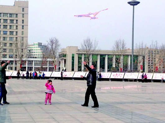 近日,记者来到济北政务广场,远远望去各个年龄段的市民放开长长的线,空中则飘满各式各样的风筝,包括光头强、熊大、熊二、喜羊羊、奥特曼等儿童喜爱的动画片角色。不会放风筝的儿童则在一旁学习。