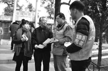 孔庙,志愿者向游客宣传文明旅游。本报记者 姬生辉 摄