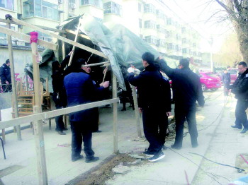 城管局牡丹区执法大队执法人员拆除占道经营的麻将棚厦。     通讯员 孟令涛 摄