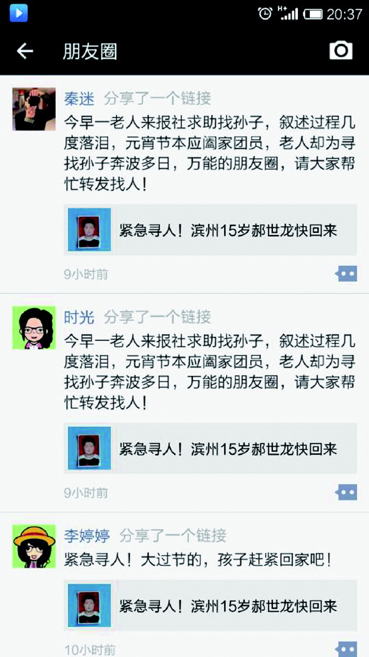 5日上午,一位老人来到本报编辑部,焦急地告诉记者他的孙子已离家三天,至今没有任何音讯。本报第一时间通过官方微博、微信发布了此消息,短时间内就达到了6万多的阅读量和110余次的转发量。在网友的爱心接力下,5日中午孩子联系上了家人,表示将尽快回家。