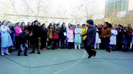5日下午,滨州市人民医院举行了趣味运动会庆祝第105个三八妇女节,大跳绳、背部夹球接力赛、3人4腿接力跑等5项比赛在团结热烈的气氛中有序进行。院党委书记崔秀娥、院长徐宏来到运动会现场和大家一起观看并参与了比赛项目。