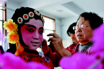 ▲工作人员在给演员扎头饰。