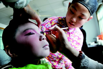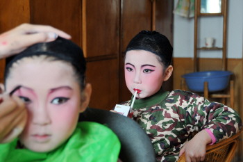 ▲小演员在化妆,引来小伙伴观看。
