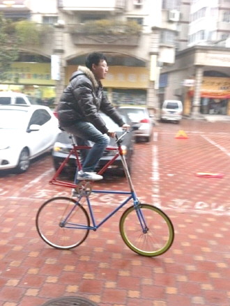 时间:2015年1月13日 自述:在街头小伙子骑着改装过的自行车,拉风地驶过。 点评:技术果然高。