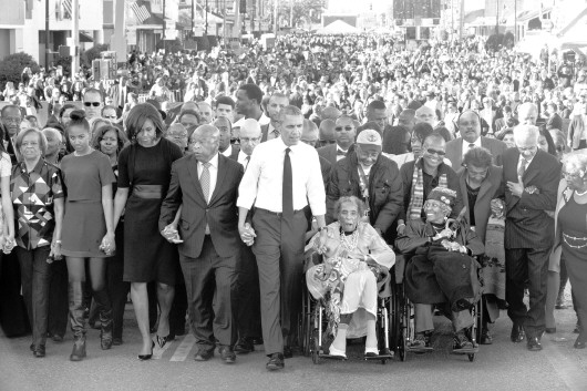 7日,在美国亚拉巴马州塞尔马,美国总统奥巴马(中)牵着参加过1965年美国黑人民权运动大游行的博因顿的手(坐轮椅者)走在埃德蒙·佩特斯桥上,旁边还有美国众议员刘易斯(第一排左四)和第一夫人米歇尔(第一排左三)。 新华/美联