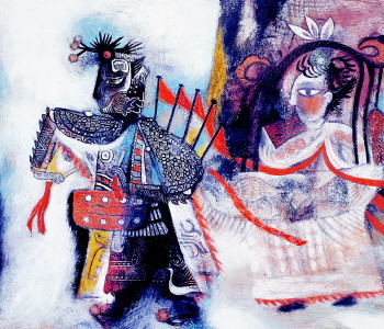 1986年起,韩敬伟开始用四年的时间造访黄河文化,吸收民间传统艺术精神和表现方法。他在青海高原上与朝圣的僧人结伴而行,和黄土高原的老汉一起放羊打连枷,和船夫一起漂流黄河,去感受黄河文明的伟大和中华民族的深刻,在这种向民族文化寻根的过程中,他逐渐找到了艺术上的灵魂,也聚集了创造力量。他开始借助彩陶、敦煌壁画,汉画像石和魏晋墓壁画的遗风,借着民间艺术自由创作状态的启迪,逐步摆脱心理束缚,按照自己的理想愿望进行创作。他的人物画作品开始呈现出了具象写实延续、抽象结构、具象与抽象结合、色墨结合等多个面貌,色彩鲜明,造型夸张,富有浓厚民间美术特点,装饰性极强。