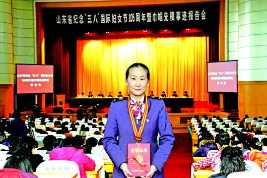 2015年,济南铁路局济南客运段高铁列车长尹小津被评为“全国三八红旗手”。2014年以来,尹小津所在班组先后获得旅客来信、来电和锦旗表扬30余次,荣获全国铁路女职工先进集体、全国“工人先锋号”称号。尹小津先后获得路局先进生产者、优秀共产党员、第九届“十大杰出青年”、最美班组长、优秀技能人才,全路火车头奖章。图为尹小津在南郊宾馆参加山东省“三八”国际妇女节105周年暨巾帼先模事迹报告会。 本报通讯员 王东陵 摄