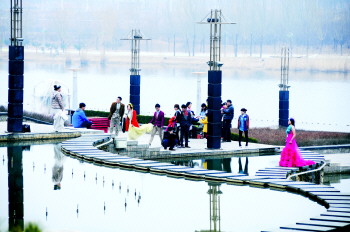 春季植物开始萌芽复苏,8日,在减河湿地,多对新人借着气温回暖之机拍摄婚纱照。 本报记者 马志勇 摄