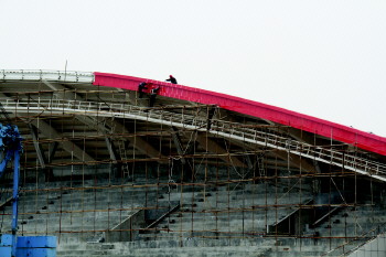 负责体育馆施工的青岛建安集团总工程师周浩介绍,观众席上的座椅下方将安装通气口,主要是为了方便后期调节温度及提升空气的流动性,增强观众的舒适度,这种设计已经达到国内先进体育场馆的设计施工水平。据了解,目前体育场东、西看台及体育馆土建施工已完成,钢结构安装基本结束,正在进行内部装饰、消防设施及外部幕墙施工。