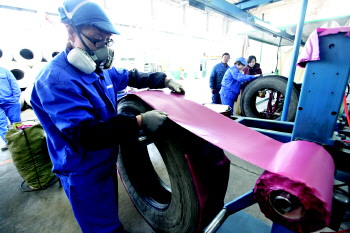 戴着专业防尘口罩的修华会对每一个经过外胎打磨的旧轮胎内腔进行检查,强光照射灯发出的热量令人有烘烤的感觉。