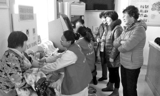 三八节当天,前进社区计生服务站医生为居民免费量血压、测量血糖,提出科学饮食建议。