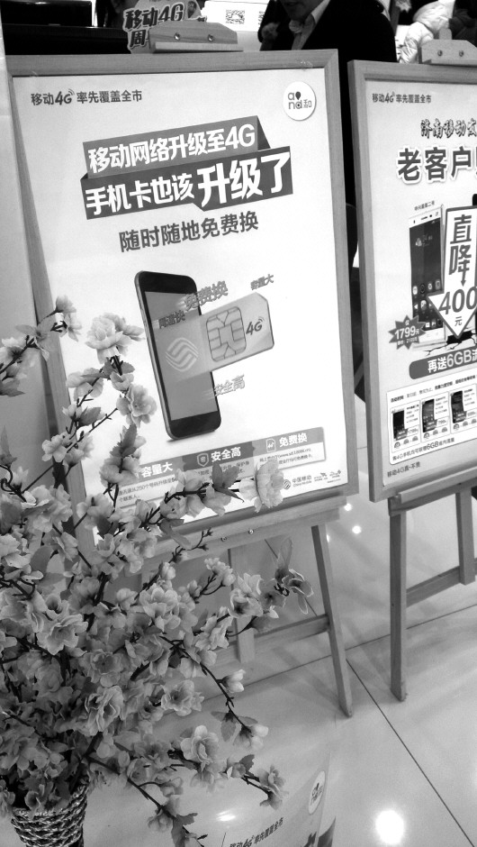 ▲移动营业厅随处可见各种升级4G宣传。 本报记者 马绍栋 摄
