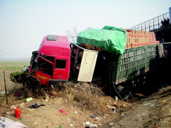 10日凌晨3点左右,青岛路政大队值班路政员接到报警,青银高速公路银川方向112公里处两辆货车追尾,其中一辆车还冲进沟底,驾驶员受伤被困。接警后,路政人员迅速出动,同时通知119救援人员和120急救中心前来协助。赶到现场后,路政人员发现现场一片狼藉,路边沟内,一辆河北牌照的解放货车车头已经严重变形,驾驶员被挤压在变形的驾驶室里,方向盘卡住腰,已经坍塌的驾驶棚压在头顶,他的右手已经骨折变形,司机不断发出痛苦的呻吟,情况十分危急。