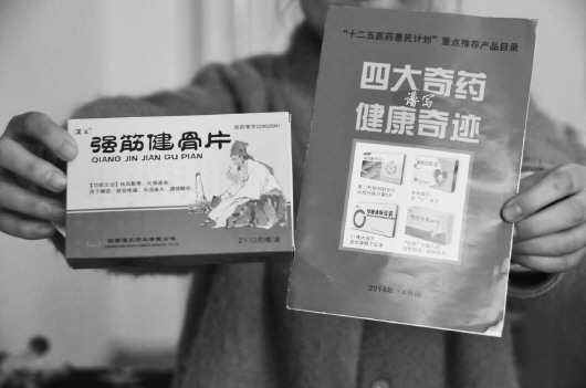 去年,王大爷看到一种黄姜膏药的广告就打电话订购了几贴,随着药品寄来的还有一张药品广告单,这张广告单印有“十二五医药惠民计划重点推荐产品目录”的字样,推荐“四大奇药”。王大爷见其中一种“奇药”前列舒乐片的功效挺好就决定购买十盒试试疗效,结果他接到的快递药品却是十盒强筋健骨片。