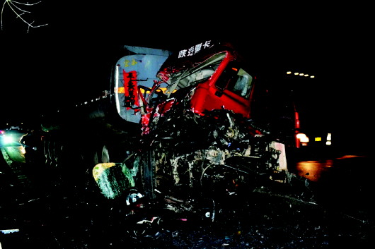 9日凌晨3时许,在沾化辖区新海路两辆大货车追尾,车损严重。民警到达现场后发现后方车辆驾驶员被卡在驾驶室内,便迅速组织人员将驾驶室后车门撬开,将驾驶员吴某从驾驶室内救了出来,幸好吴某受伤并不严重。经询问双方驾驶人得知,吴某因疲劳在驾驶过程中打起了盹,等他发现前方有货车时已来不及采取任何措施。本报通讯员 张云梓 张景峰 本报记者 孙秀峰 摄影报道