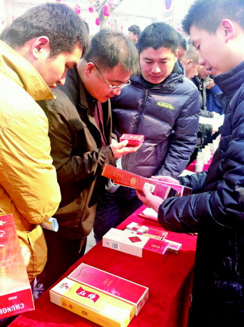 3月13日上午,在聊城市金鼎购物中心门前广场,2015聊城市东昌府区“3.15”国际消费者权益日纪念活动举行,来自东昌府区工商局、东昌府区消协等十余个部门的工作人员现场接受市民的咨询和投诉,教市民辨别烟、酒、阿胶等物品的真假。 本报记者 李军 摄
