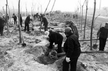 3月14日,在岔河西大道东侧,园林工人正在紧张植树,当天植树成百上千棵。 本报记者 王小会 摄