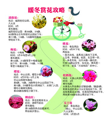 本报3月15日讯(记者 吕璐) 天气回暖花开早,赏花攻略提前知。记者走访发现,十梅庵景区和中山公园的梅花已争相开放,市区内街边的玉兰花、迎春花等也已露出笑脸。专家分析,接下来若无强冷空气,预计花期较往年将提前一周左右。大珠山的杜鹃花、中山公园的樱花、青岛周边的桃花等将陆续开放,想踏青的市民有很多选择。