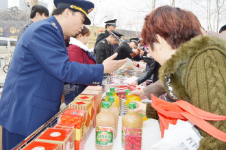 “3.15”活动现场,市食药监局工作人员正在讲解关于食品安全的知识,吸引了不少市民围观和咨询。“像这种小孩经常吃的零食,没有生产日期,也没有经过卫生部门许可,是非常不安全的,小朋友们尽量不要吃这些食物。”市食药监局的工作人员说。图中,不少消费者向工作人员请教汇源果汁真假辨别方法。 本报记者 贾晓雪 摄影报道