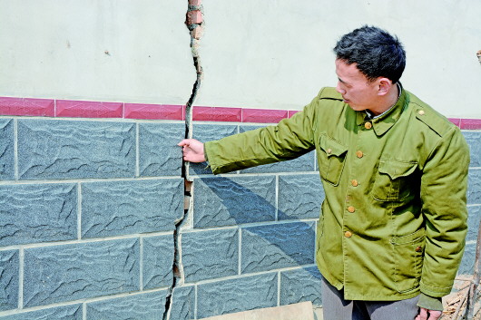 “裂缝内能伸进去一只手!”13日上午,济南天桥区大桥镇司家村一位村民说。2010年起,由于新阳煤矿采煤导致该村房屋开裂倾斜,农田塌陷。尽管该公司已为司家村赔偿一千多万元,但去年的农田赔偿款至今未到位。而住在危房中的村民,整天担心害怕。