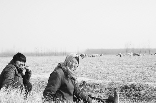 ◤两名妇女在撂荒的地里放羊。因为一到夏天就淹,村民不敢种地,只能养羊。