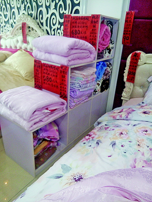 记者一进门,店长就热情地介绍说:“店里的驼毛被180元,羽绒加羽丝绒的160元。桑蚕丝被有三个等级,有580元的,以前卖2200多元。这个最高等级的现在处理价是680元,还有一个450元的。”