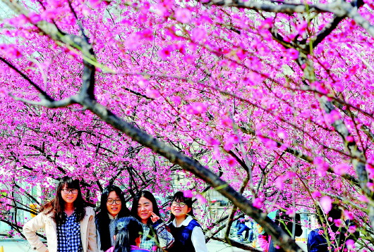 16日在山东大学中心校区,一株株盛开的红梅,在明媚阳光的照耀下,为百年老校平添了几分春意与活力。