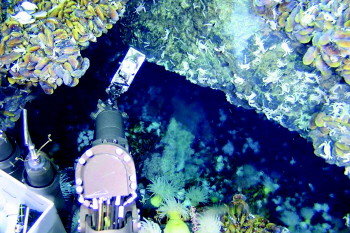 “蛟龙”号载人潜水器进行热液喷口保真取样及温度测量。(图片由国家深海基地管理中心提供)