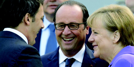 德国总理默克尔(右)、法国总统奥朗德(中)和意大利总理伦齐(左)在一起。(资料片)