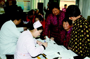 村民们正在等待接受体检。 本报记者 郭庆文 摄
