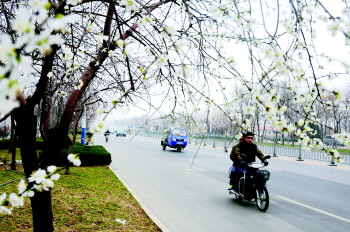 17日,天衢东路绿化带内的行道树花枝绽放,锦簇的繁花吸引着过往市民的目光。 本报记者 马志勇 摄