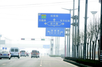 近日,有市民反映高铁新区三八东路上的多条道路交通指示牌上的路名与道路路名不符,给市民造成不便,望相关部门尽快统一。以崇德八大道为例,三八路上的交通指示牌标注为经六路。 本报记者 马志勇 贺莹莹 摄影报道
