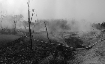 17日下午2时许,市体育馆西侧绿化带大片枯枝莫名起火,毁及不少刚刚栽种的树苗。 本报记者 徐良 摄