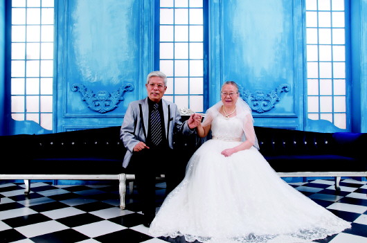 春寒料峭,但是天气变化却影响不了王春喜老人的好心情,76岁的他脸上洋溢着幸福,显得格外激动,因为他刚拿到了和妻子王素云的婚纱照。结婚50年来,这是他们第一次穿上婚纱礼服拍照留念。