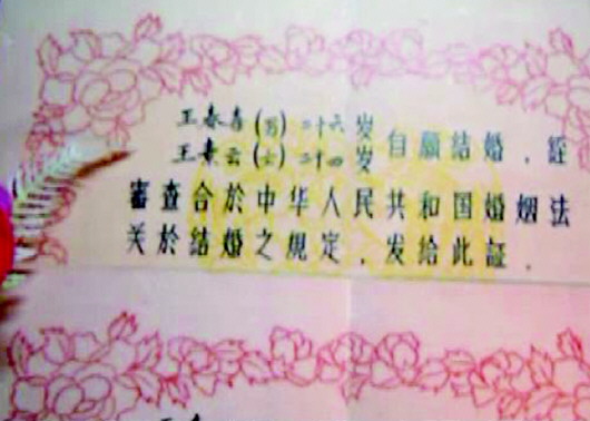 1961年,王春喜的父亲不远千里,先到公主岭,后到北京城,与各方磋商,最后达成了一致意见,同意他们的婚事。1965年3月15日,王春喜和王素云在北京领取了结婚证。