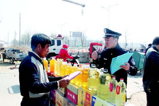 3月13日,滨州市公安局开发区分局民警在沙河办事处范集村大集进行3·15宣传。活动通过现场发放宣传单、接受市民咨询等方式,向广大市民传授各类产品的辨假、识假、防假技巧。当天,共发放传单500余份,有效提高了广大消费者维权的意识和能力。 本报通讯员 陈凌燕 本报记者 王忠才 摄